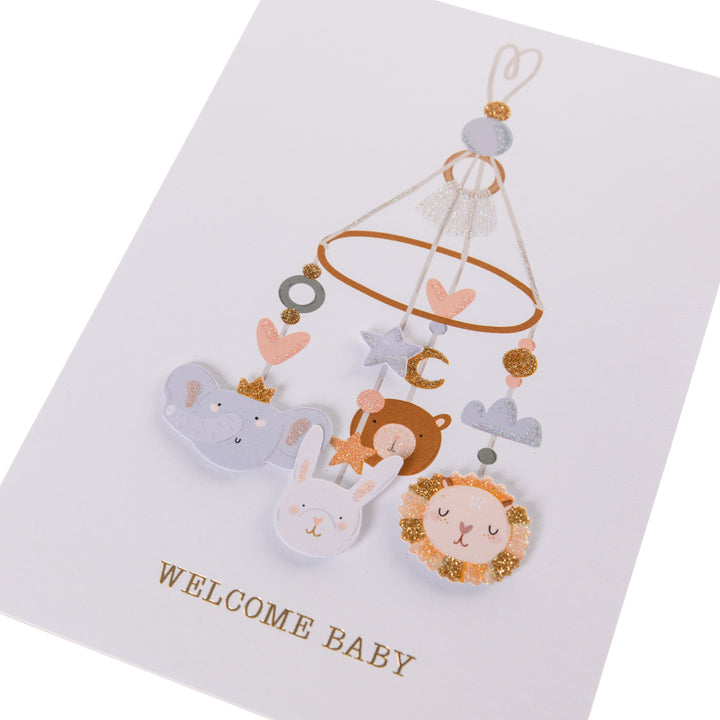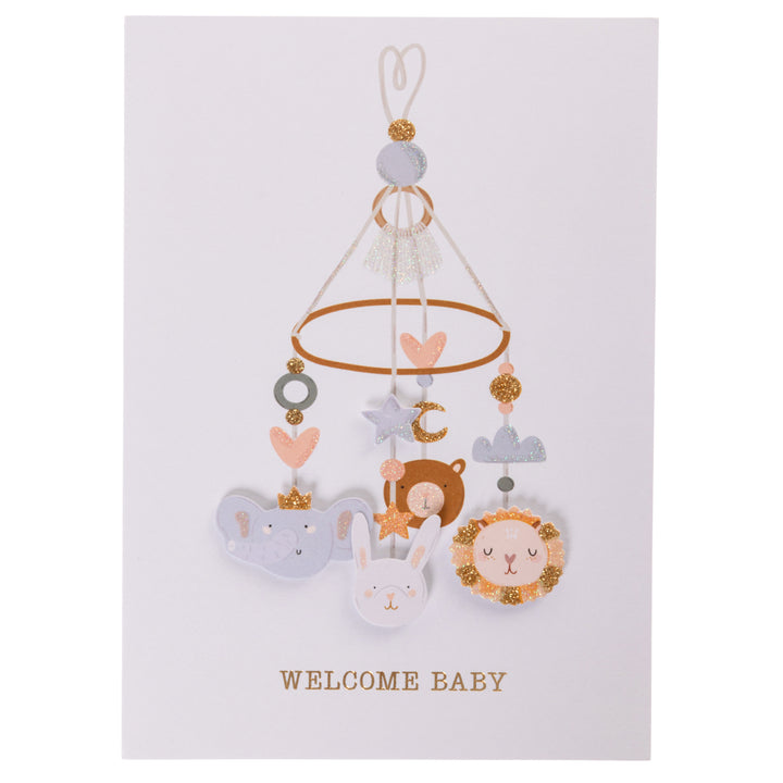 This adorable card features a whimsical mobile of cuddly animal friends sprinkled with soft pastel tones and shimmering gold details. Paired with a cheerful orange envelope and gold “Happy Mail” seal, it’s the perfect way to send love, joy, and congratulations to new parents.