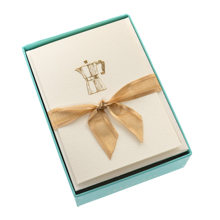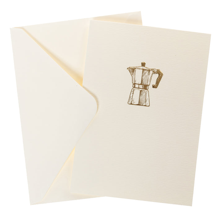 A classic brew for modern correspondence. This boxed card set features a vintage-style gold foil Moka espresso maker icon, pressed onto luxuriously textured cream paper. Perfect for coffee lovers and stationery enthusiasts alike, these cards blend old-world charm with everyday elegance—because every note should feel as satisfying as the perfect cup.