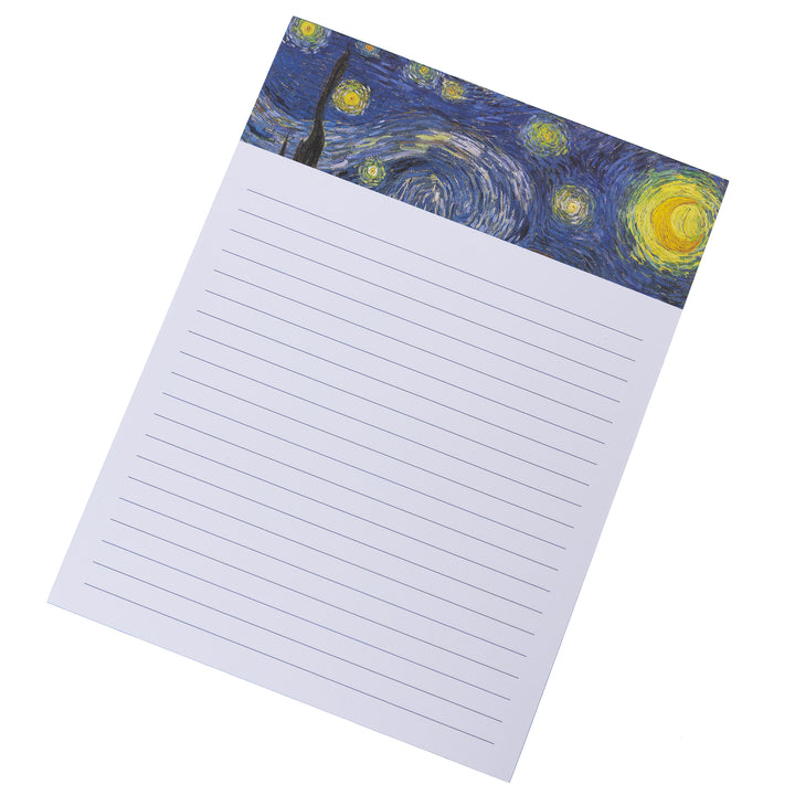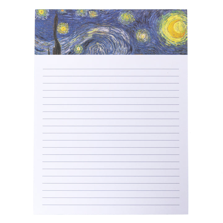Artful inspiration for everyday notes. This large notepad features Vincent van Gogh’s iconic The Starry Night (1889), a masterpiece of swirling skies and luminous color. Reproduced in vivid detail, the cover brings the spirit of post-Impressionist brilliance to your daily lists, thoughts, and reminders. A perfect blend of function and fine art—designed to elevate even the simplest scribbles.