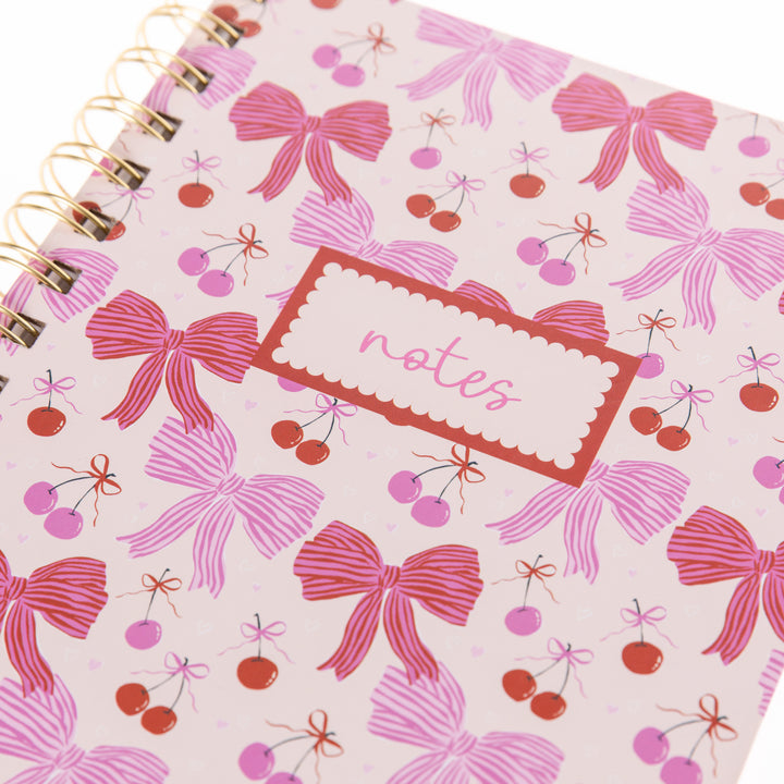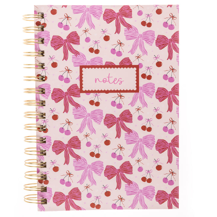 This spiral journal is bursting with playful charm, featuring a cover decorated in bold pink bows and cheerful cherries. With its gold spiral binding and plenty of lined pages inside, it’s perfect for jotting down ideas, lists, or daily thoughts. A delightful mix of fun and function, this journal makes every note feel a little more fabulous.