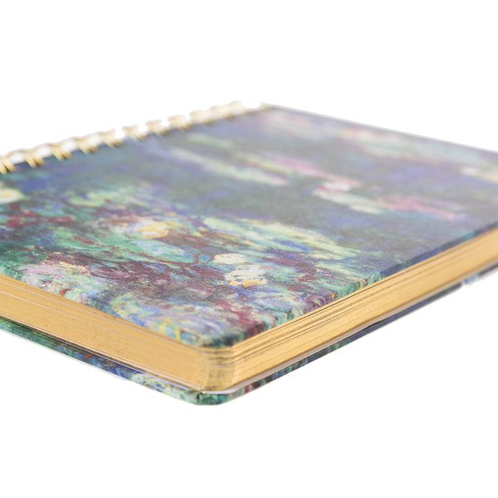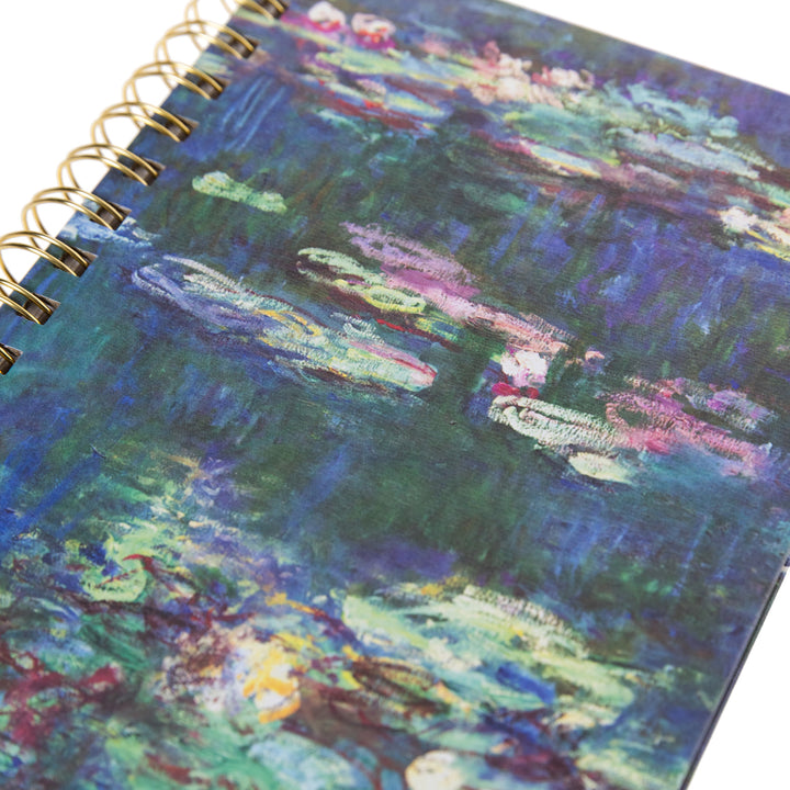 A masterpiece for your musings. This spiral hardbound journal features Claude Monet’s Water Lilies, a serene reflection of the artist’s beloved garden in Giverny. With gilded paper edges and a durable lay-flat spiral binding, it combines artistic beauty with everyday function. Let the soft brushstrokes and tranquil palette inspire your thoughts, sketches, and reflections—page after elegant page.
